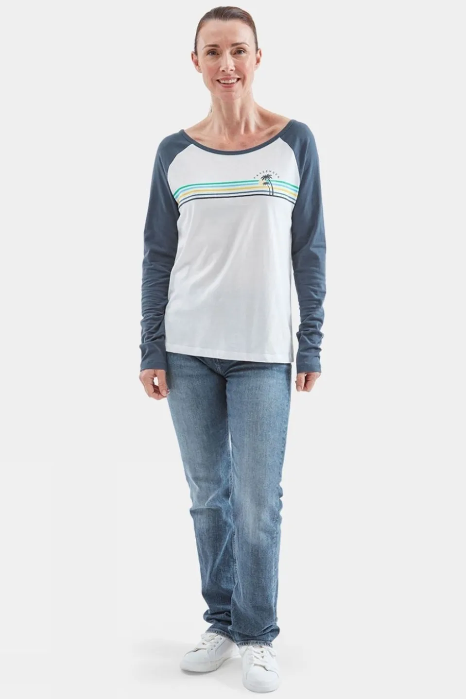 Crafted from a recycled and organic cotton blend, thissummery raglan style long sleeve tee is built for hazy days like these. With a front screen print and contrast colour blocking, this women’s Palm recycled long sleeve tee is an everyday essential.