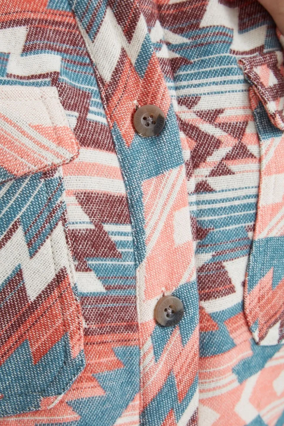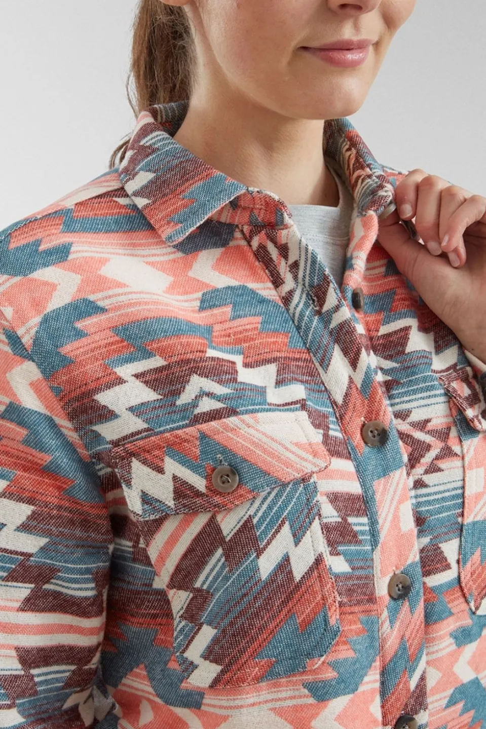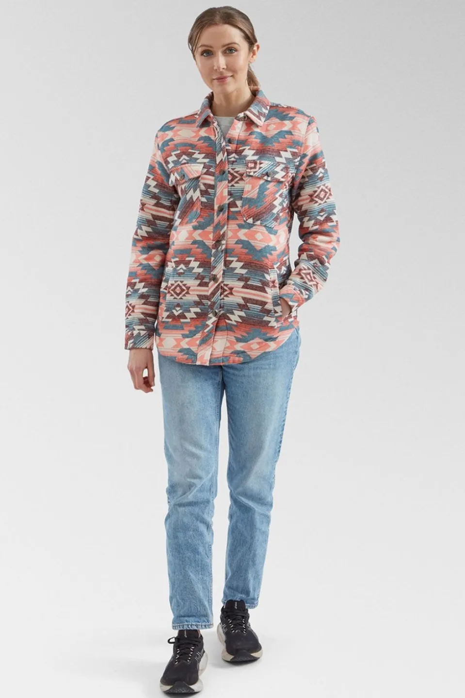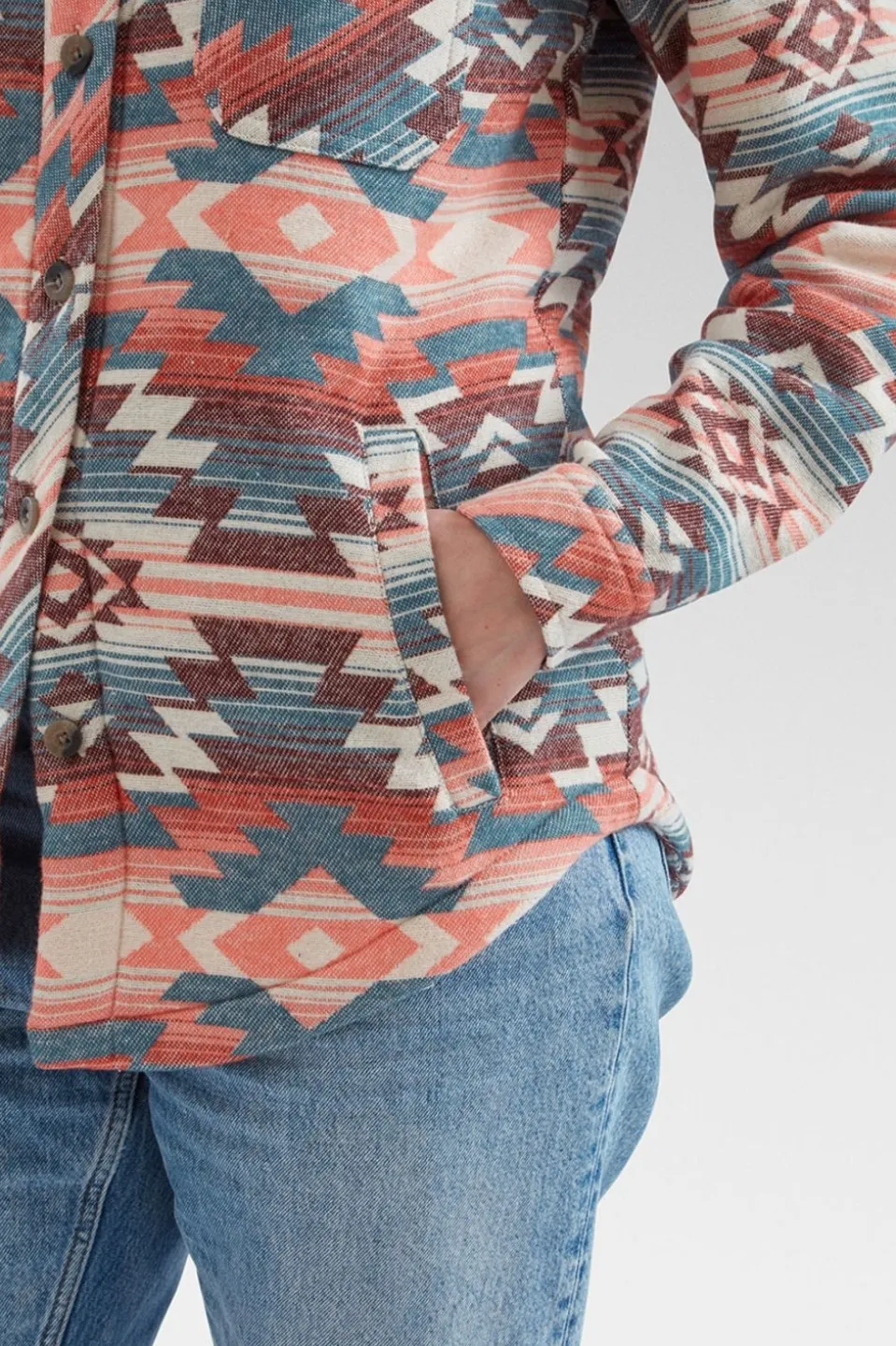 The Stella Aztec Overshirt is equipped with thoughtful details to enhance your comfort and convenience. The front is adorned with buttons, allowing for easy adjustment, while the two chest pockets and two side pockets provide ample storage for your essentials. The curved hem and buttoned cuffs add a touch of refined style, ensuring you look effortlessly chic whether you’re exploring the great outdoors or relaxing in the city.