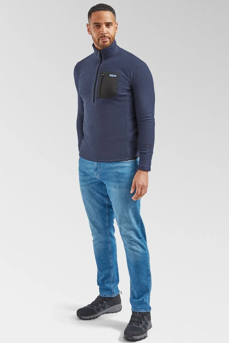 Extremely light and packable, Patagonia have built the technical R1 Air fleece with hollow core yarns and a lofted zig-zag texture to trap air, move moisture and breathe for exceptional warmth without weight during high-exertion, non-stop activities in cold conditions.