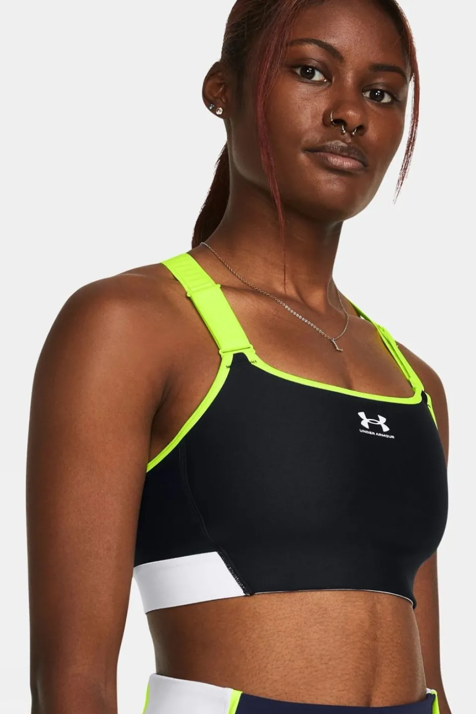 The Women’s HeatGear High Pocket Sports Bra by Under Armour is constructed with precision and eliminates the need for doubling up, pinching, or slipping during high-intensity activities. Incorporating Under Armour’s HeatGear technology ensures effective sweat-wicking, keeping you cool and dry even during the most intense training sessions. The held-in feel is achieved through a compression fit that ensures optimal support and stability. The smooth, adjustable straps provide a customisable and secure fit, secured effortlessly with a hook, allowing for a hassle-free workout.